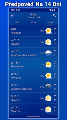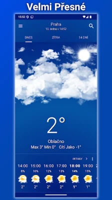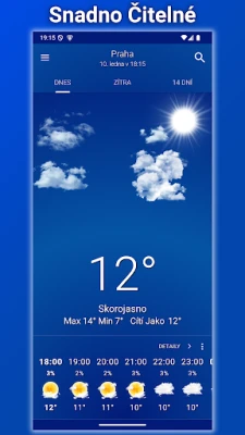Jasné Nebe poskytuje velmi přesné hodinové předpovědi počasí na 14 dní dopředu. Sledujte déšť, vítr a teplotu s detailními informacemi a nádhernými animacemi. Intuitivní rozhraní zajistí, že vás počasí nikdy nepřekvapí.